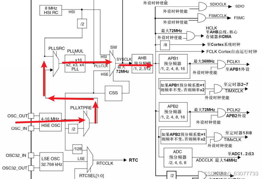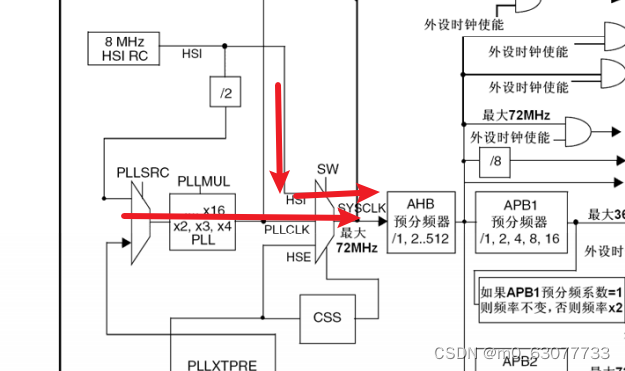 - //所以最终:AHB和APB2都是72MHZ,APB1是36MHZ