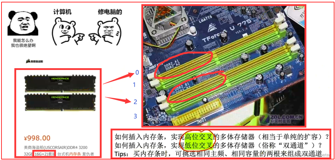 • 主存储器:计算机的主要内存用于暂时存储运行中的程序和数据。(一般是ROM+RAM)
