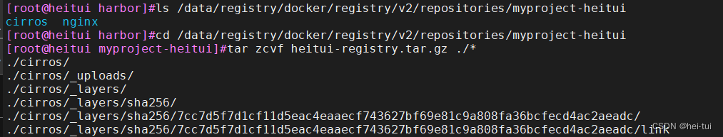 - cd /data/registry/docker/registry/v2/repositories/myproject-heitui