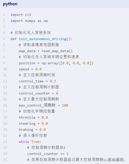 以下是一个基于Python的简单示例代码,演示如何使用5G技术实现无人驾驶: