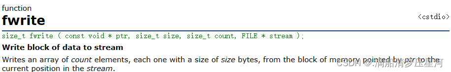 fwrite:从ptr指向的内存块里面写count个大小为size的数据,到stream流(二进制形式)。