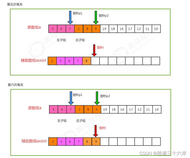 2.将相邻的两个子组进行合并成一个有序的大组;