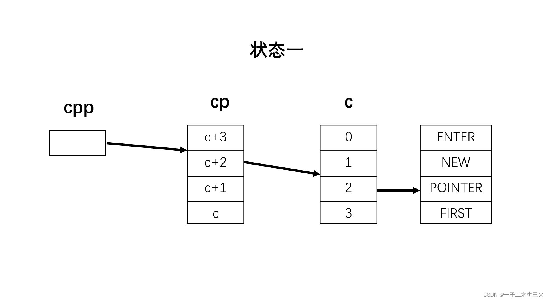 cpp[-2]等价于*(cpp-2),也就是指向cp的位置,存的是c+3的地址,解引用后得FIRST的首地址,最后+3得ST