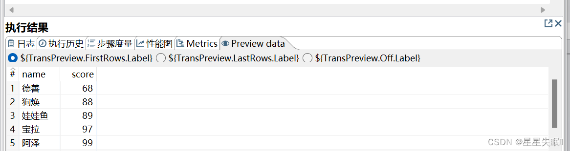 在转换设计界面中,点击三角形按钮开始执行转换,在弹出的界面中点击“启动”,如果转换执行成功,在两个控件图标上都会显示绿色的勾号。这时,在“执行结果”的“Preview data”选项卡中就可以预览排序后的数据
