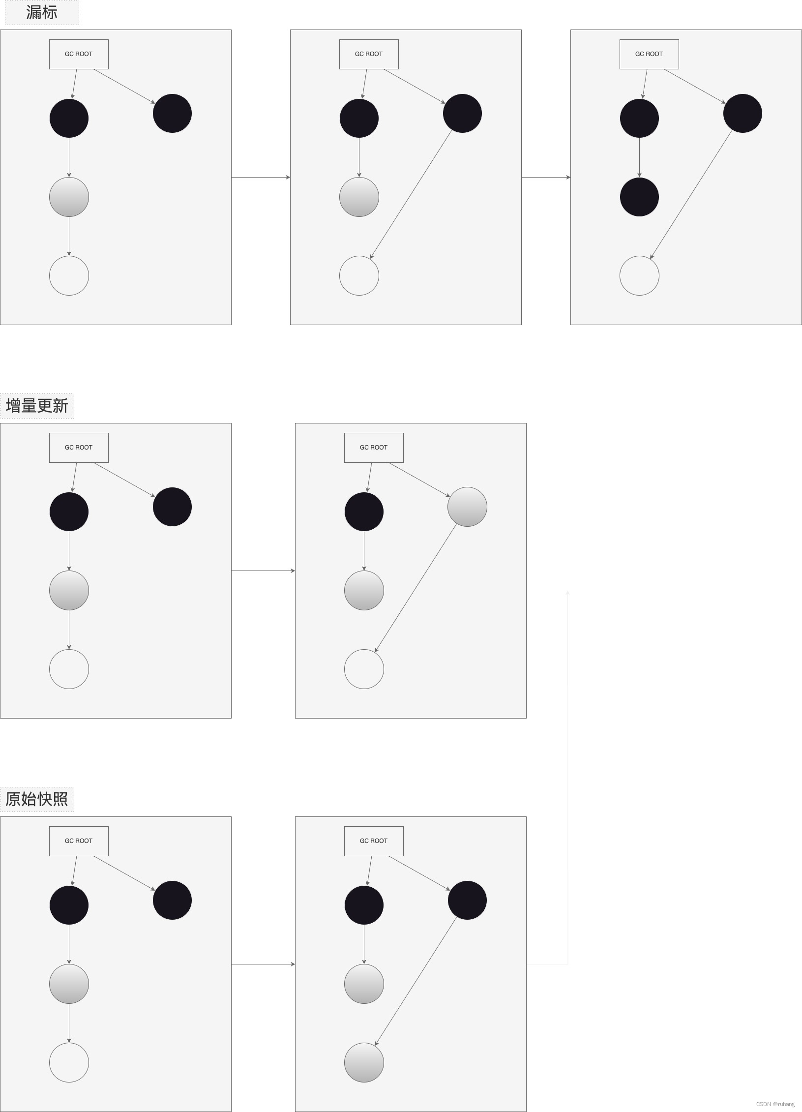 首先是增量更新,增量更新要破坏的是第一个条件,当黑色对象插入新的指向白色对象的引用关系时,就将这个新插入的引用记录下来,等并发扫描结束之后,再将这些记录过的引用关系中的黑色对象为根,重新扫