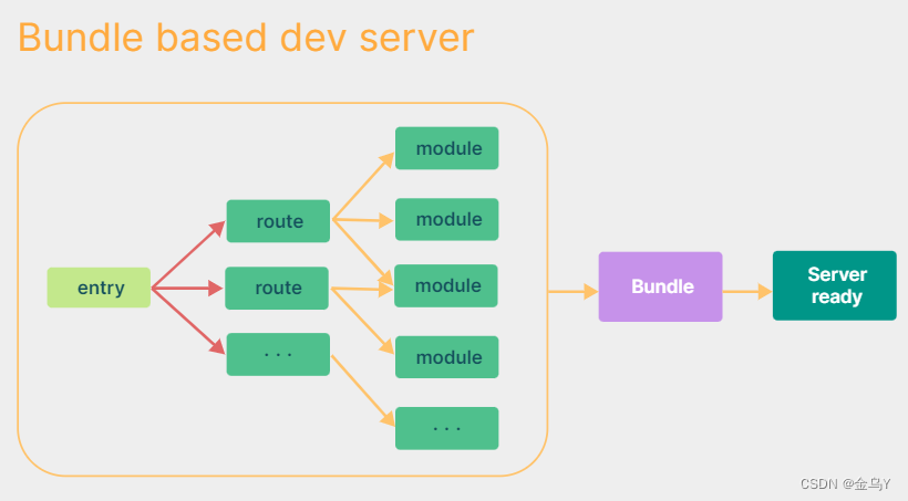 在 Vite出来之前,传统的打包工具如 Webpack 在服务器启动之前,需要从入口文件完整解析构建整个应用:先解析依赖、打包构建再启动开发服务器,Dev Server 必须等待所有模块构建完成,当我们修改了 bundle 模块中的一个子模块, 整个 bundle 文件都会重新打包然后输出。项目应用越大,启动时间越长。因此,有大量的时间都花在了依赖生成,构建编译上。