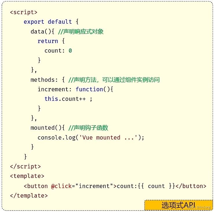我们现在还是依照我们之前学的旧方式写一个vue页面,来对比理解。我们之前的那种写法,我们称之为选项式API