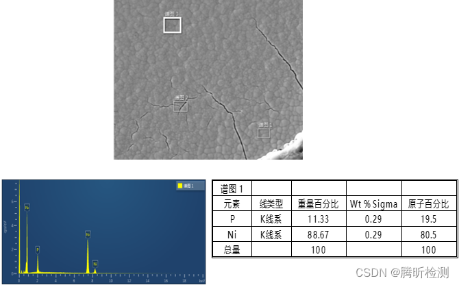 测试结果:富磷层P含量为21.24%(说明Ni过渡析出),正常Ni层P含量为9.97%。