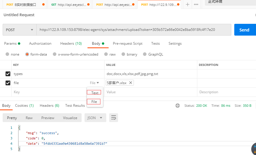 则用postman中的Body_form-data传参,里面支持传text和file文档