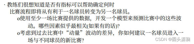 确定选好题之后。我们就题目以及四个问题进行讨论。首先有很多人都会把题目研究的这个momentum翻译成动量,但是我分析了之后觉得,气势这一说法更加符合整个题目吧。所以我觉得题目研究的就是网球比赛中的气势,用所给的数据里面的各种指标对这个气势进行分析。准确的理解题意对解题来说是很关键的。