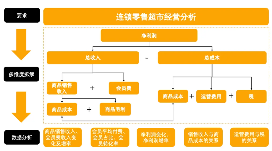 首先是净利润本身,通过对比不同年份的数据,对公司的整体情况进行评价,了解企业的发展趋势和变化。而净利润=收入-成本,再对收入、成本进行多维度的分析,在分析收入的过程中,还对会员数据进行了分析,层层拆解以分析超市的整体盈亏情况,如下图所示。