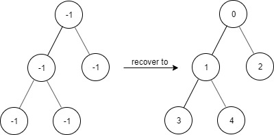 root.val == 0treeNode.val == x 且 treeNode.left != null,那么 treeNode.left.val == 2 * x + 1treeNode.val == x 且 treeNode.right != null,那么 treeNode.right.val == 2 * x + 2现在这个二叉树受到「污染」,所有的 treeNode.val 都变成了 -1。