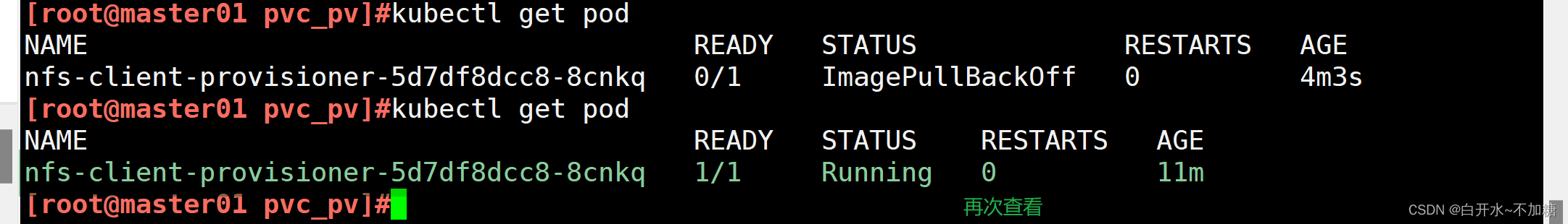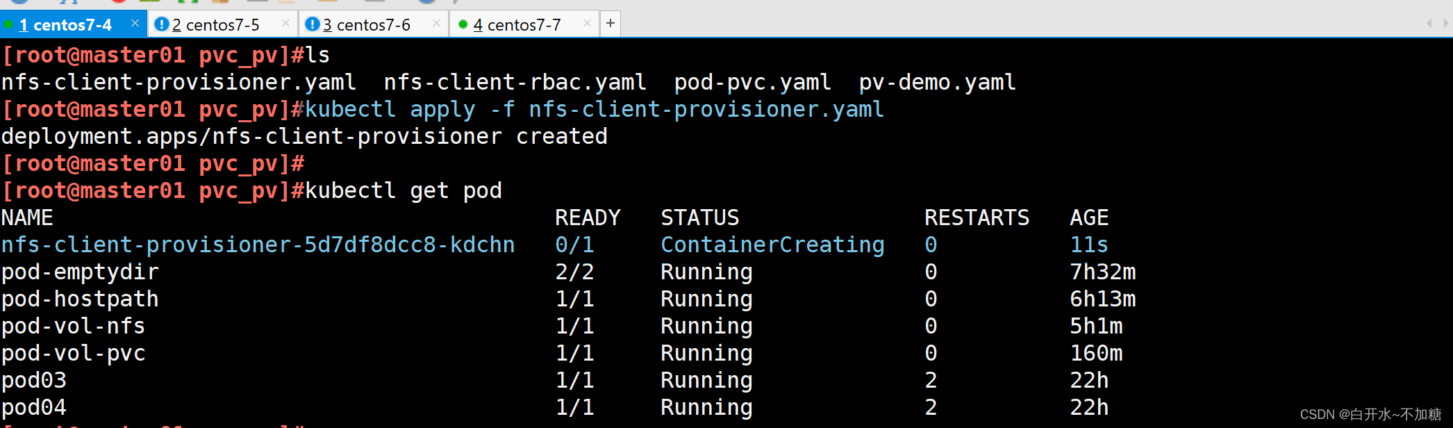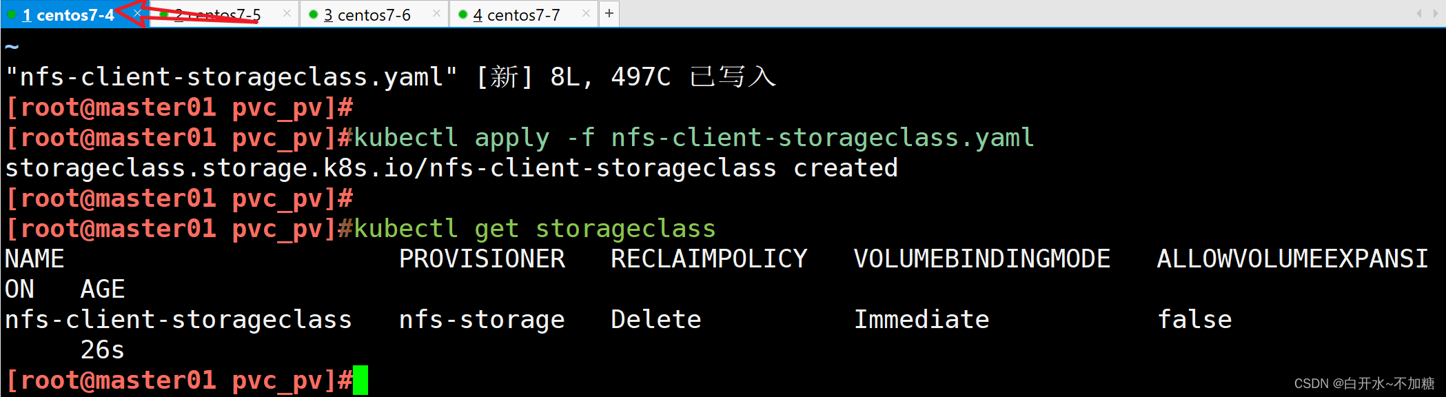 - kubectl apply -f nfs-client-storageclass.yaml: 通过 Kubernetes 的命令行工具 kubectl 应用(或创建)nfs-client-storageclass.yaml 文件中定义的资源,这里是一个 StorageClass。