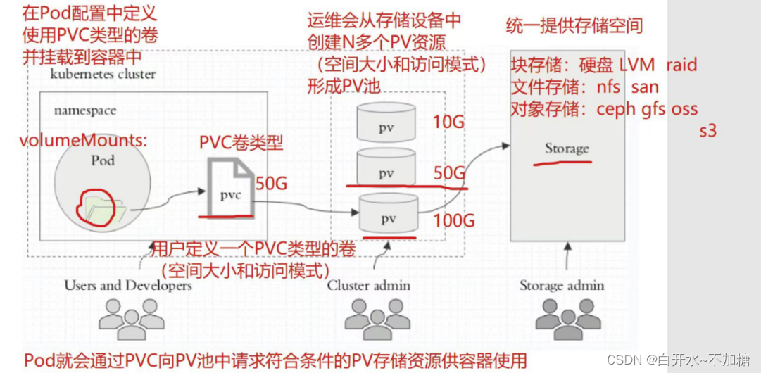 2)如果是外置存储卷插件,需要先创建serviceaccount账户(Pod使用访问apiserver使用的账户)和RBAC授权(创建角色授予相关资源对象的操作权限,再将账户与角色绑定),使得serviceaccount账户具有对PV、PVC、StorageClass等资源的操作权限