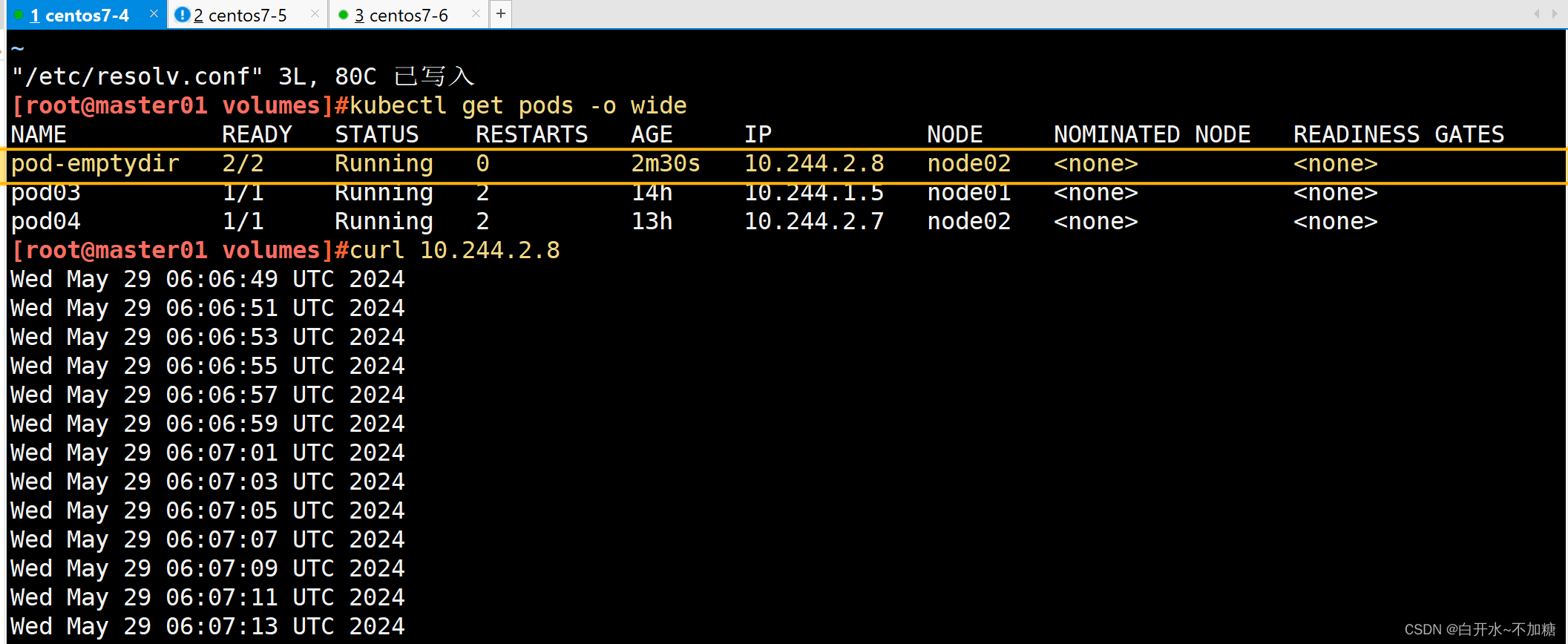 在上面定义了2个容器,其中一个容器是输入日期到index.html中,然后验证访问nginx的html是否可以获取日期。以验证两个容器之间挂载的emptyDir实现共享。