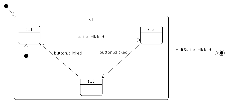 通过对状态s1、s2和s3进行分组,我们可以实现相同的行为(即单击Quit按钮退出状态机,而不管状态机处于哪种状态)。这是通过创建一个新的顶级状态并将三个原始状态设置为新状态的子状态来实现的。下图显示了新的状态机。
