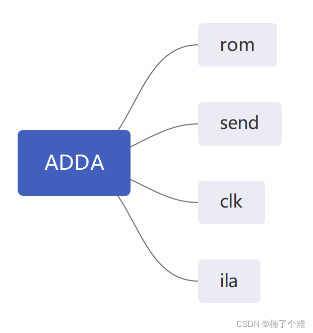 FPGA 顶层模块(hs_dual_da) 例化了以下三个模块: DA 数据发送模块(da_wave_send)、 ROM 波形存储模块(rom_1024x10b)和时钟模块(clk_wiz_0)