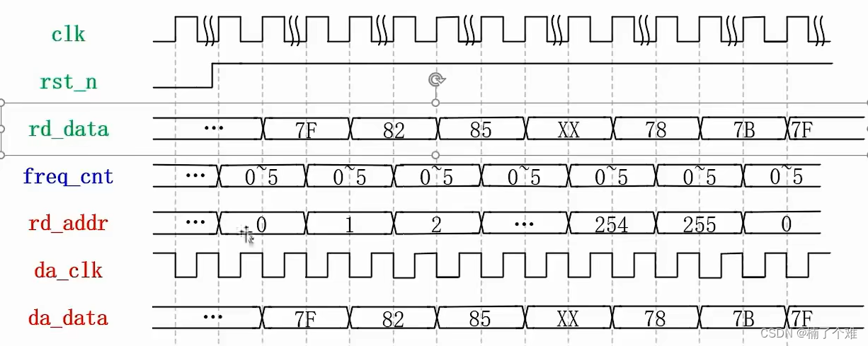 - //数据rd_data是在clk的上升沿更新的,所以DA芯片在clk的下降沿锁存数据是稳定的时刻