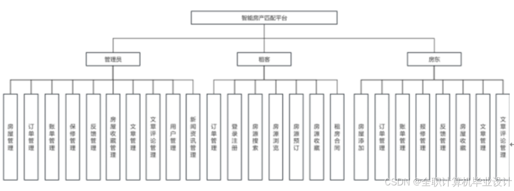 该智能房产匹配平台提供了全面的管理功能,涵盖了房屋管理、订单管理、账单管理、报修管理、反馈管理、房屋收藏管理、文章管理、文章评论管理、用户管理以及新闻资讯管理等方面。管理员可以通过平台进行添加、编辑和删除房屋信息,包括房屋图片、价格和描述等内容。此外,管理员还能够查看和处理用户提交的订单,包括确认订单和取消订单等操作,以及管理用户的账单信息,包括支付状态和账单详情。同时,管理员负责处理用户提交的房屋报修请求,安排维修人员进行维修,并及时回复用户的反馈信息,解决用户问题。此外,管理员还可以管理用户的房屋收藏信息,发布和编辑平台文章,以及管理用户评论,包括删除不当评论等操作。另外,管理员还负责管理平台注册用户,包括查看用户信息和禁止用户等操作,以及发布和编辑新闻资讯,包括房产市场动态和政策解读等内容。如下图 3-1 所示: