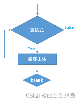 break 语句不仅可以用来终止 switch 语句,在循环语句中使用时还可以用来跳出循环,执行循环外的下一条语句。如果是在嵌套循环中使用,例如在内层的循环中使用 break 语句,那么程序只会跳出内层的循环,并不会影响到外层循环的执行。break 语句的执行原理如下图所示: