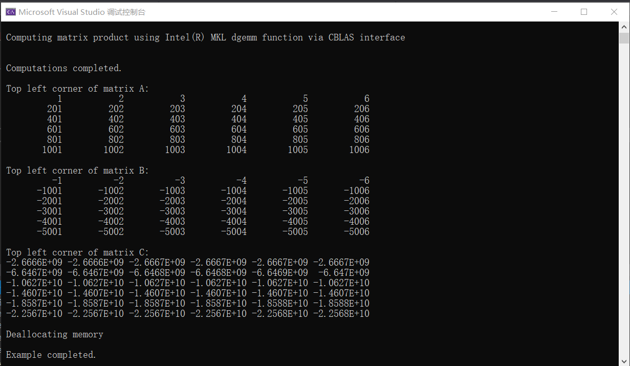 此示例是利用Intel 的MKL库函数完成计算矩阵(乘法)运算,计算式为: