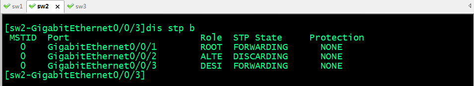 提示:可以看到现在三个交换机RSTP的角色和状态都符合我们的拓扑;