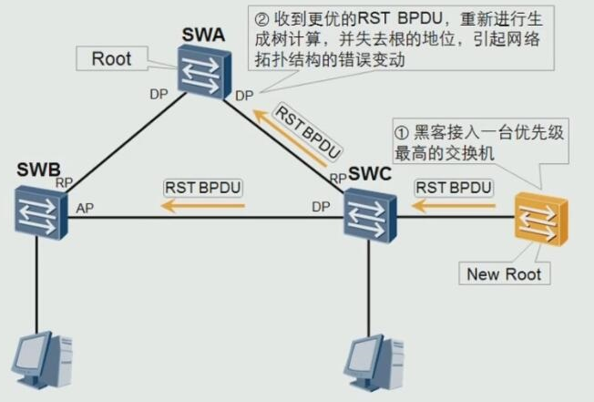 我们知道RSTP优化了STP收敛速度,同时也加入了边缘端口的机制,但是如果有人恶意使用stp特有的属性发起攻击,对于STP网络来说它也会造成网络不稳定;为了更好的保证RSTP协议在网络不稳定情况下,尽可能的保证流量的正常转发,在标准协议中新增了4中保护功能;