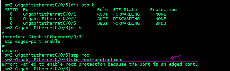实验:还是以上拓扑,我们在sw2的g0/0/3口配置根保护