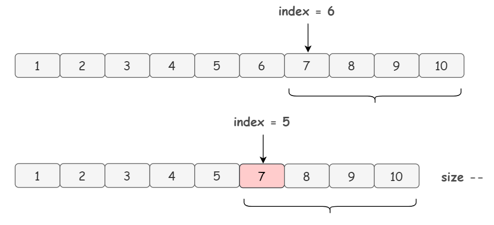 举个例子,假设我们要删除数组的 index = 5 的元素,首先,我们会复制一遍源数组,然后把源数组中从 index + 1 = 6 的位置开始到数组末尾的元素,放到新数组的 index = 5 的位置上: