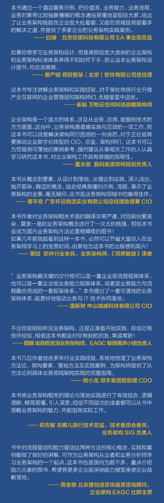本书首先在架构总述部分分别介绍了企业架构、业务架构的发展历程及主流知识体系。