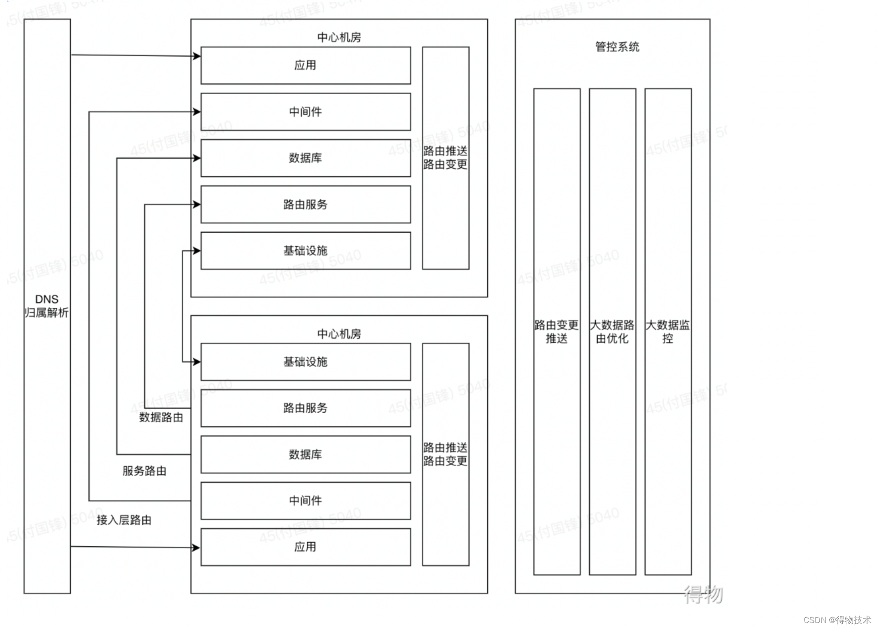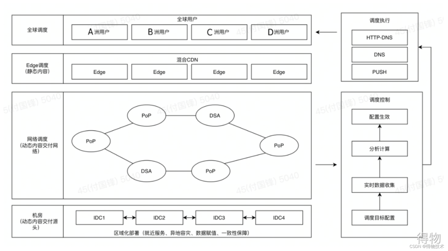 按照以上的描述,其实是可以看到,从用户出发一直到机房,会存在边缘节点调度、网络调度以及机房调度。还有调度的执行(路由的使用)以及调度的控制(路由的产生)。路由即每个用户或者每个用户组隶属于那个机房。 结构图如下;
