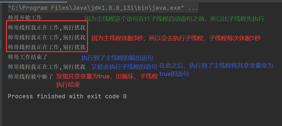 package Lambda; public class ThreadInterrupted { private static class MyThread implements Runnable{ volatile boolean isQuit=false;//共享变量 @Override public void run() { while (!isQuit){ System.out.println(Thread.currentThread().getName()+"我正在工作,别打扰我"); try { Thread.sleep(1000); } catch (InterruptedException e) { e.printStackTrace(); } } System.out.println(Thread.currentThread().getName()+"被中断了"); } } public static void main(String[] args) throws InterruptedException { MyThread m1=new MyThread(); Thread t1=new Thread(m1,"帅哥线程"); System.out.println("帅哥开始工作"); t1.start(); Thread.sleep(3000); System.out.println("帅哥工作结束了"); m1.isQuit=true; } }