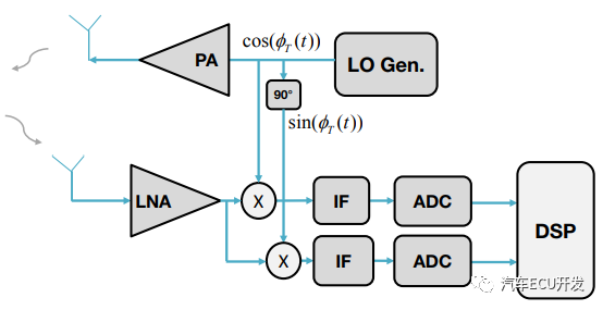 毫米波雷达利用发射信号和接收信号之间的频率差来进行测距、测速,利用天线阵元之间的相 位差来进行测角。毫米波雷达系统框图如下图所示: