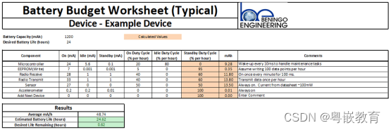 工程师估算电池的第一步,通常也是最后一步,是创建传统的电池预算。这种类型的分析通常包括创建一个电子表格,其中列出了系统中的每个组件。然后,工程师检查每个组件,确定最小、典型和最大电流消耗并记录下来。有了这些信息,工程师现在可以开始估计系统在每个消耗箱中的时间百分比。例如,微控制器可能只有5%的时间处于运行模式,25%的时间处于低功耗停止模式,70%的时间处于深度睡眠模式。