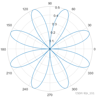polarplot(theta,rho) 在极坐标中绘制线条,由 theta 表示弧度角,rho 表示每个点的半径值。输入必须是长度相等的向量或大小相等的矩阵。如果输入为矩阵,polarplot 将绘制 rho 的列对 theta 的列的图。也可以一个输入为向量,另一个为矩阵,但向量的长度必须与矩阵的一个维度相等。