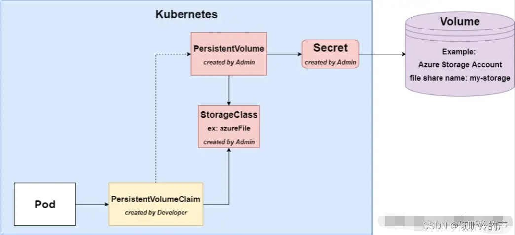 在这种情况下,Pod将直接与Volume耦合,因此它将知道存储系统(例如,Pod将与Azure存储帐户耦合)。该解决方案与云无关,它取决于具体实施而不是抽象。因此,如果可能的话尽量避免这样的解决方案。它唯一的优点是速度快,在Pod中创建Secret,并指定应使用的Secret和确切的存储类型。