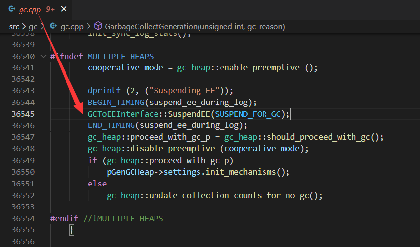 由于 GC 的触发往往是用户线程分配数据导致的,在GC触发的整个执行流中,其中有一环就是冻结 CLR执行引擎,也就是 SuspendEE,可以在 gc.app 中一探究竟。