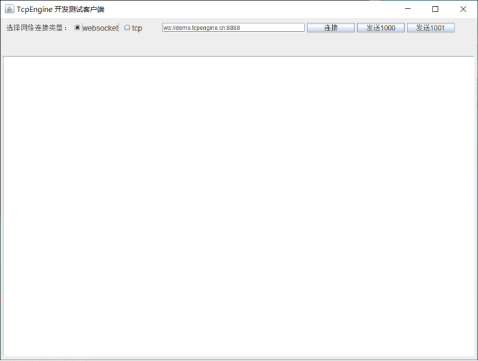 解压后在TcpEngine1.3.0\demo\TcpEngineClient目标下有两个文件startupClient.bat;TcpEngineClient.jar,双击startupClient.bat(注意,运行前本机必须配置好java运行环境,本示例是在java1.8下开发的),示例主界面如下图所示。