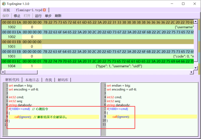 在实际应用中,我们不想显示一些指令的解析结果,比如心跳指令有很多但对我们查找问题没有帮助,这类指令的解析结果我们可以隐藏并且不影响指令转发。那么我们可以在解析规则中加入call(ignore)触发这个功能,比如我们对心跳包的结果隐藏如下图所示。