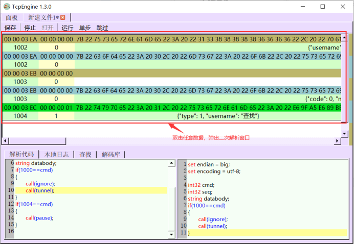 有时候我们希望网络数据解析到某条指令就暂停转发,阻塞住后面到达的数据,用于仔细分析网络现场数据或者修改数据后再发送。触发这个功能有两种方式,一、点击工具栏暂停按钮;二、在解析规则中加入call(pause),如下图所示,当解析到指令id = 1004 时,TcpEngine暂停转发数据。