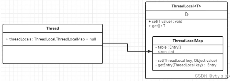 Thread类中有一个ThreadLocal.ThreadLocalMap threadLocals = null的变量,ThreadLocal相当于是Thread类和ThreadLocalMap的桥梁,在ThreadLocal中有静态内部类ThreadLocalMap,ThreadLocalMap中有Entry数组