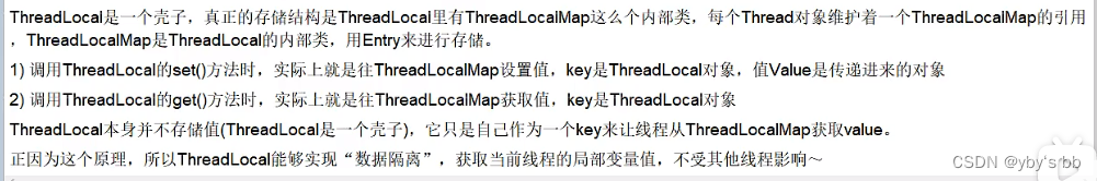 ②. 每个线程持有一个只属于自己的专属Map并维护了Thread Local对象与具体实例的映射,该Map由于只被持有它的线程访问,故不存在线程安全以及锁的问题