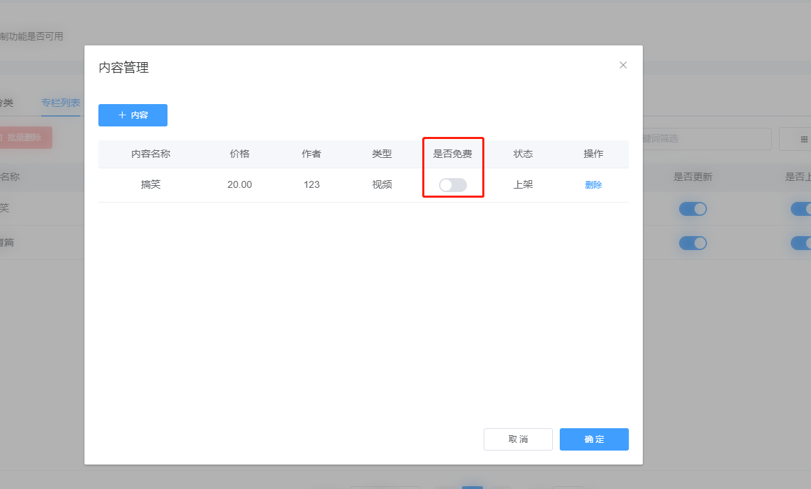 7,添加专栏分类,设置专栏,注意更新状态及上架状态;在内容管理中如开启免费按钮,可以免费阅读,如下图。