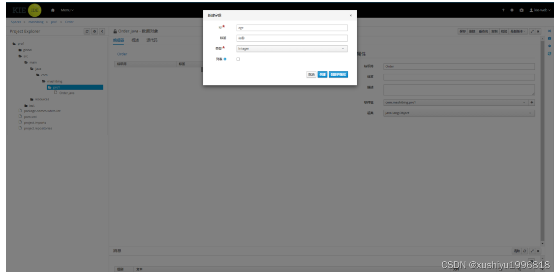 ID 位置,输入java bean的字段,标签是备注信息,类型选择对应的字段类型,保存,点击创建,关闭弹窗,点击创建并继续,可以继续创建。