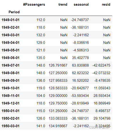 将原始数据除以趋势,即用#Passengers例除以2×12-MA列得到一个新列:detrended