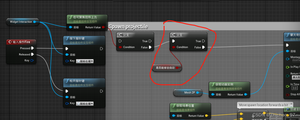 创建 以函数名设置定时器 节点,表示延迟0.1s执行全自动射击事件