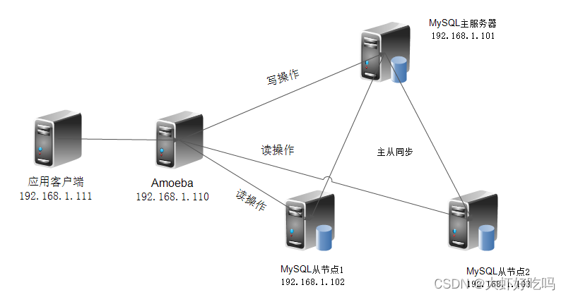 下图中,一台MySQL主服务器带两台MySQL从服务器做了数据复制,前端应用在进行数据库写操作时,对主服务器进行操作,在进行数据库读操作做时,对两台从服务器进行操作,这样大量减轻了主服务器的压力。