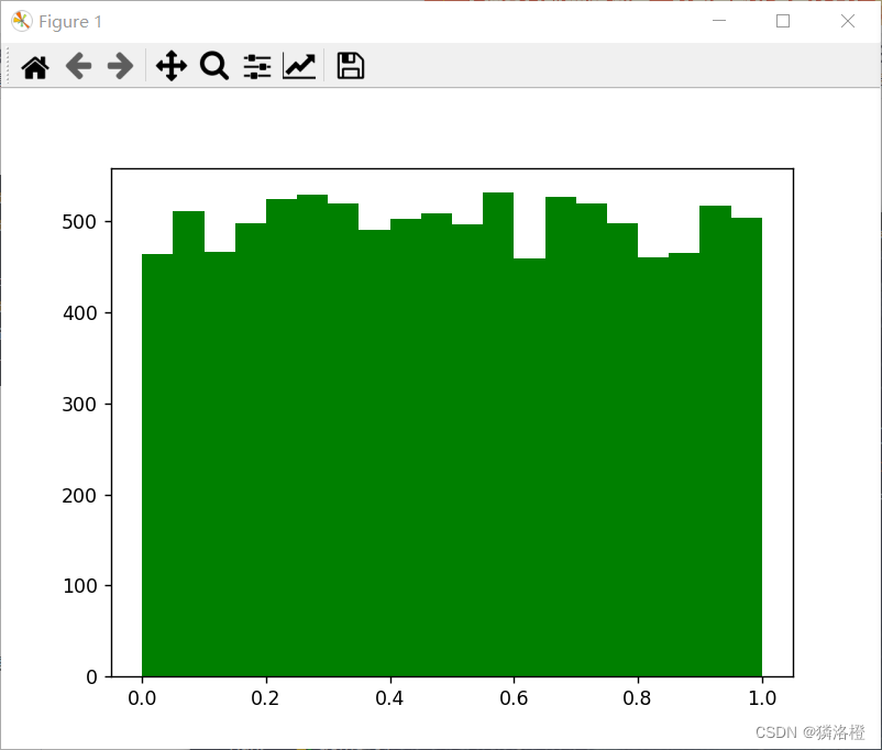 import numpy as np import matplotlib.pyplot as plt p = np.random.rand(10000) np.set_printoptions(edgeitems=5000, suppress=True) plt.hist(p,bins=20,color='g') #分成20份 plt.show()效果