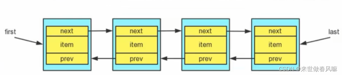 3)每个节点(Node对象),里面又维护了 prev 、next 、item 三个属性,其中通过 prev 指向前一个,通过 next 指向后一个节点。最终实现双向链表