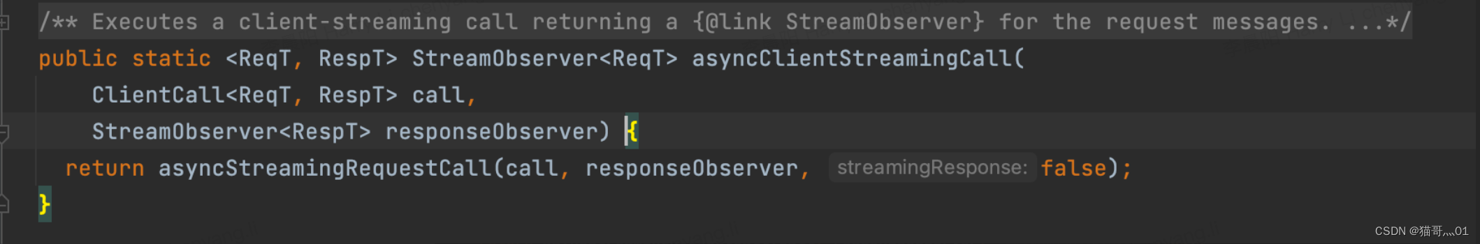 构造 Streaming 响应对象 StreamObserver并实现 onNext 等接口,由于服务端也是 Streaming 模式,因此响应是多个的,也就是说 onNext 会被调用多次。